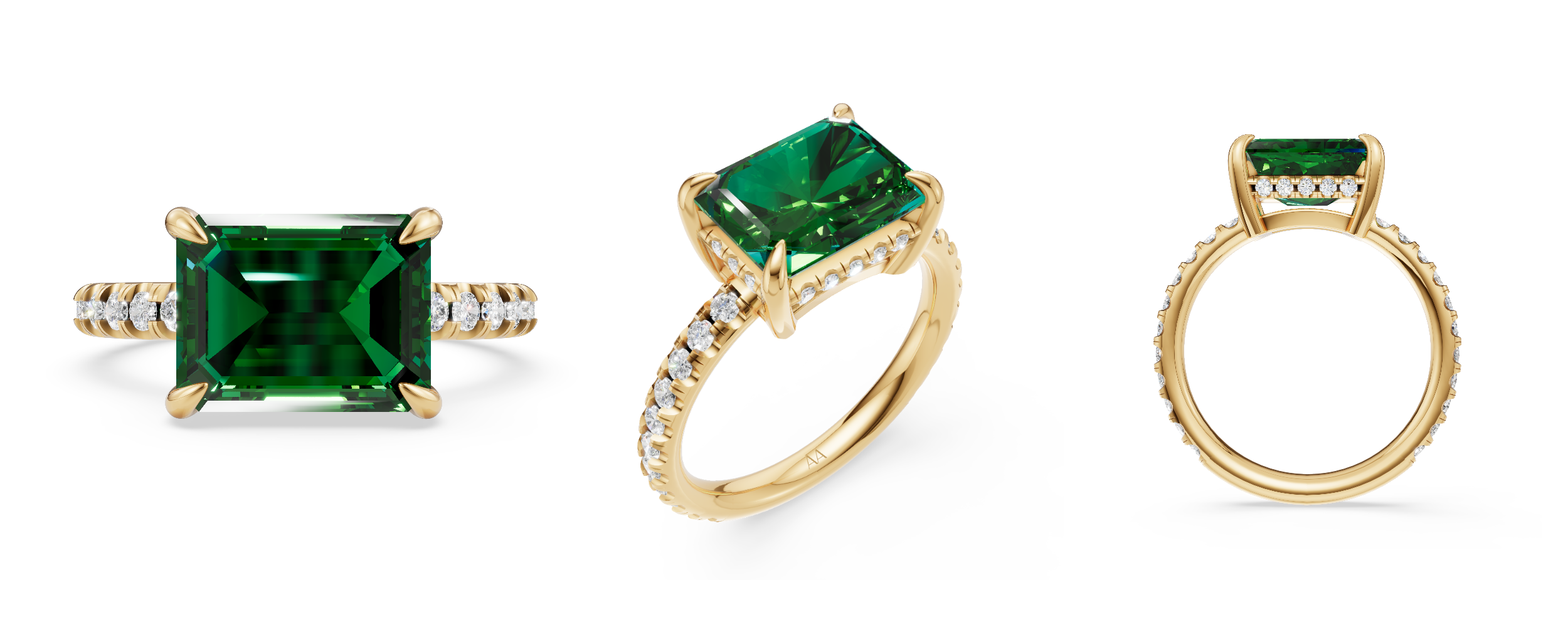 18K Yellow Gold 3 Carat East-West set Lab Emerald and White Diamond pavé ring.